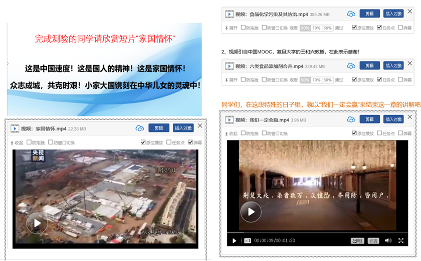 虽然利用“超星泛雅”主要是完成网上授课,但在这医无私、警无畏的特殊日子里,我认为宣传热爱祖国、热爱和平的民族精神是很有必要的。于是,在某些章节后面增加了爱国教育的宣传(见图1,左面的是放入本科生课程里的)。