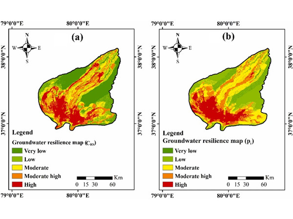 图2.  基于Dempster-Shafer模型的地下水恢复力空间分布:(a) CRS, (b) pi.