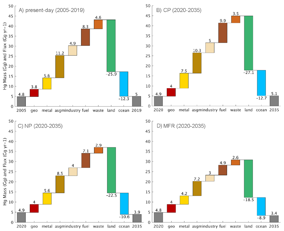 先前研究发现2010–2015年一次人为汞排放量以平均1.78%/年的速率在增加(Streets et al. 2019)。本研究通过耦合模式计算得到2005–2019年间总的一次排放的积累量为38,200吨,造成大气中的汞质量增加了500吨,预计剩余的排放将分别储存在陆地(68%)和海洋(32%)中,表明陆地可能是大气中汞排放主要的汇。此外考虑三种不同的排放情景:当前政策(CP),新减排政策(NP)和最大可行减排(MFR),对2035年的排放进行预测,结果表明,在当前政策情景下,大气中汞含量略有上升;而新政策和最大可行减排情景下,大气中汞含量分别下降1,000 吨和1,400 吨。在所有情景下,陆地仍然是一次汞排放主要的汇。该研究还发现在新政策和最大可行减排情景下,由于再排放的变化速率比一次排放要慢得多,导致来自陆地和海洋再排放可能会减缓未来一次排放减少带来的减排效应。因此,为了降低环境中的汞水平,需要更加积极的排放控制措施。